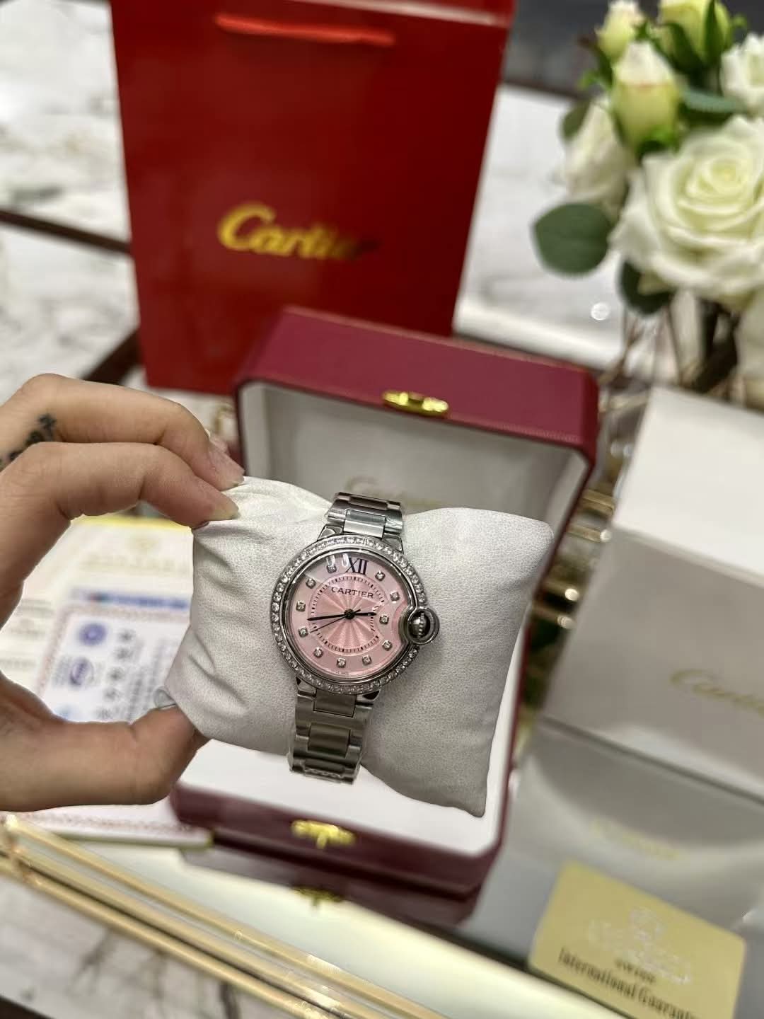 Pink face Cart watch with box {exact}